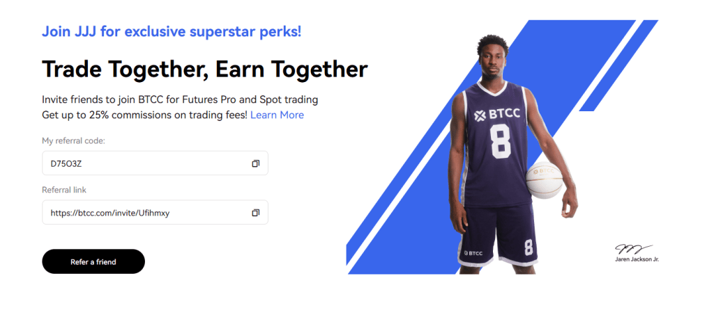 When users invite friends to sign up on the BTCC platform, they will receive a certain percentage of the trading fee as commissions each time their friends complete a trade.