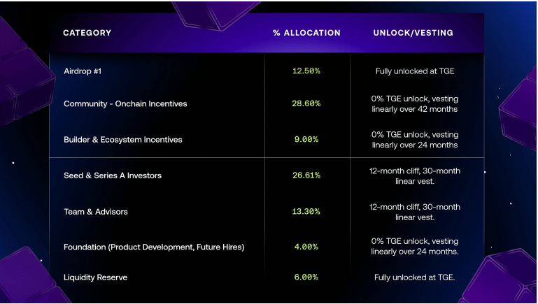 | Community – Onchain Incentives | 28.60% | 0% TGE unlock, vesting linearly over 42 months |