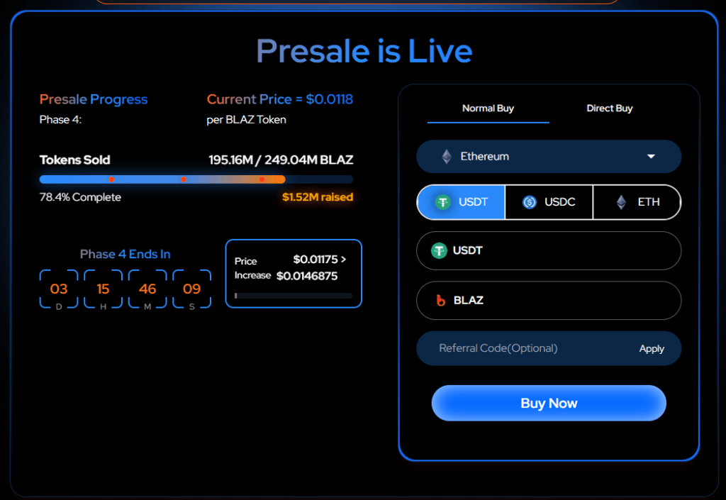 Currently in Phase 4 of its presale, $BLAZ tokens is available for just a discounted price of $0.0118 with 78.4% of the sales target selling out. When it moves to next phase, $BLAZ would see a price jump of 25% to $0.0146875.