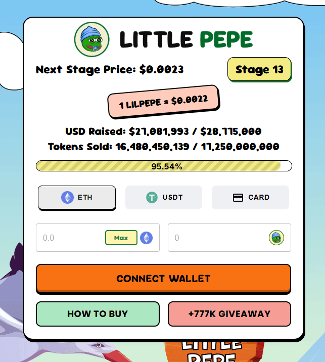 Little Pepe launched presale for its native token $LILPEPE. According to its tokenomics, 26.5% of the total supply is allocated to presale buyers.