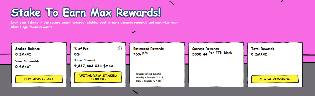 The staking rewards of Maxi Doge are currently valued at 76% APY. With over 9.8 billion $MAXI tokens already staked, this reflects significant community participation and provides great value. However, just as the presale price will increase over time, the staking rewards will decrease as the staking pool grows. This dynamic favours investors who buy early, which is a key factor in MAXI’s explosive presale success.