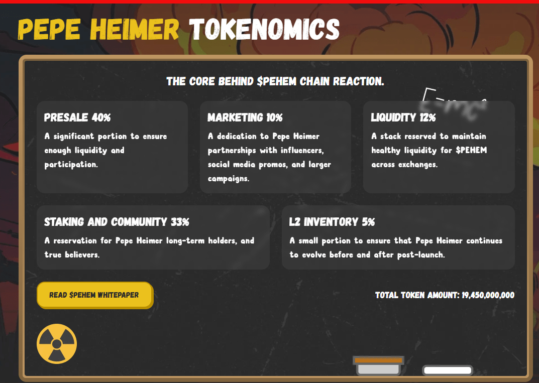 | Staking and Community | 33% | A reservation for Pepe Heimer long-term holders, and true believers. |