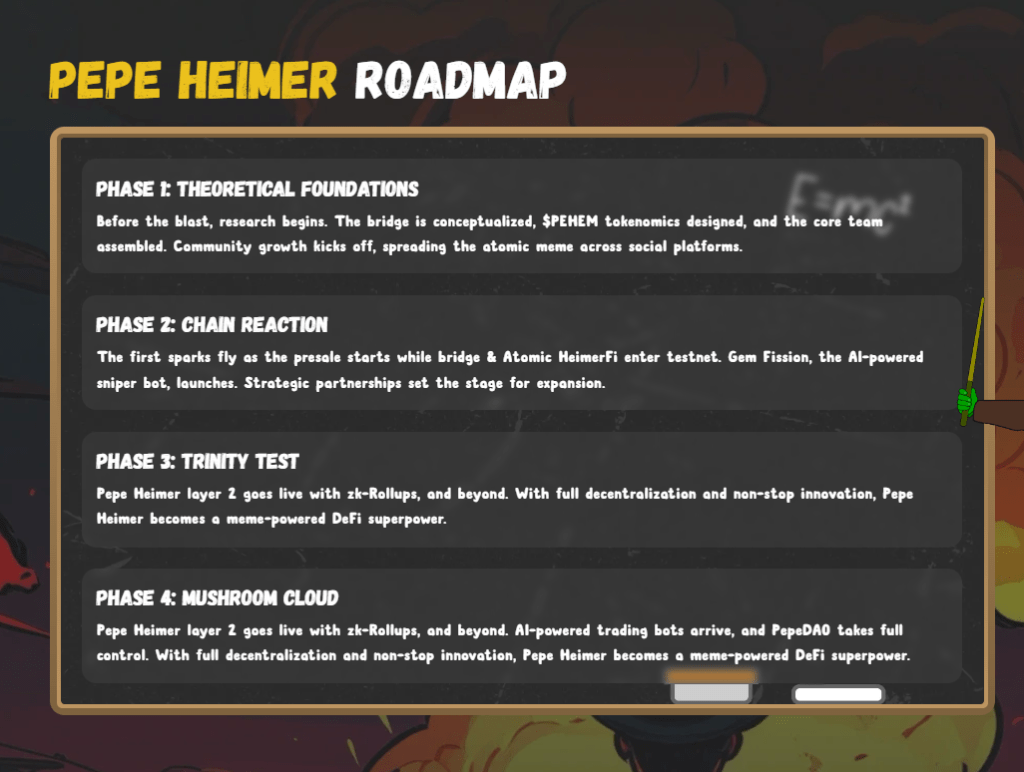 | Before the blast, research begins. The bridge is conceptualized, $PEHEM tokenomics designed, and the core team assembled. Community growth kicks off, spreading the atomic meme across social platforms. | The first sparks fly as the presale starts while bridge & Atomic HeimerFi enter testnet. Gem Fission, the AI-powered sniper bot, launches. Strategic partnerships set the stage for expansion. | Pepe Heimer layer 2 goes live with zk-Rollups, and beyond. With full decentralization and non-stop innovation, Pepe Heimer becomes a meme-powered DeFi superpower. | Pepe Heimer layer 2 goes live with zk-Rollups, and beyond. AI-powered trading bots arrive, and PepeDAO takes full control. With full decentralization and non-stop innovation, Pepe Heimer becomes a meme-powered DeFi superpower. |