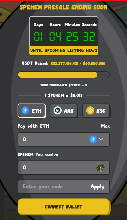 Pepe Heimer’s presale has raised over $52.2 million so far, with current pricing at $0.015 per $PEHEM token. This strong performance indicates increasing investor confidence and anticipation around the project’s potential.