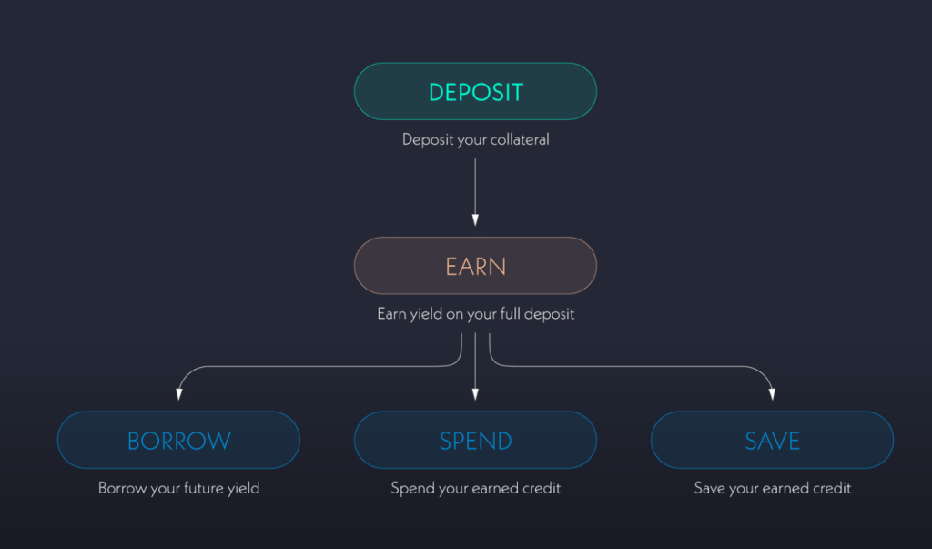 Deposit collateral into their preferred yield strategy to start earning interest, and be able to take out a loan. Use they deposit to borrow and receive alAssets while thier deposit earns interest.