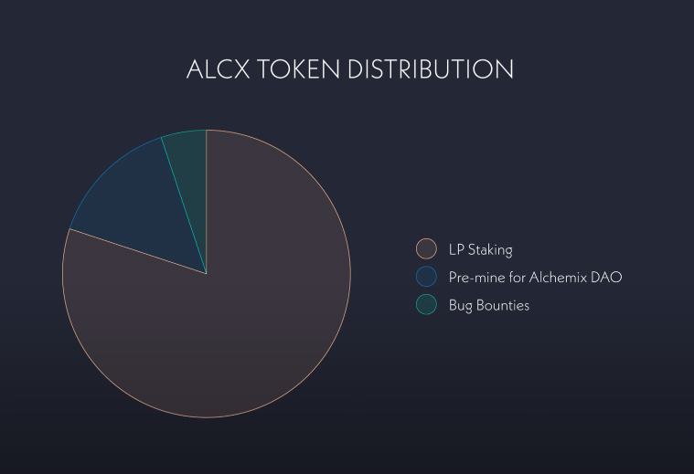 New tokens are minted weekly (2,200 ALCX indefinitely) to incentivize liquidity providers and contributors. Over 80% of the initial supply was distributed to stakers and liquidity providers. Token emissions are distributed to liquidity providers, the treasury and contributors to the protocol.