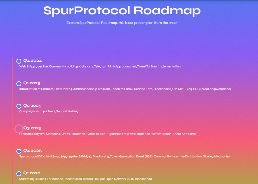 The Spur Protocol roadmap shows the project’s journey from initial launch to major expansion by Q2 2026. Here’s a complete summary:
