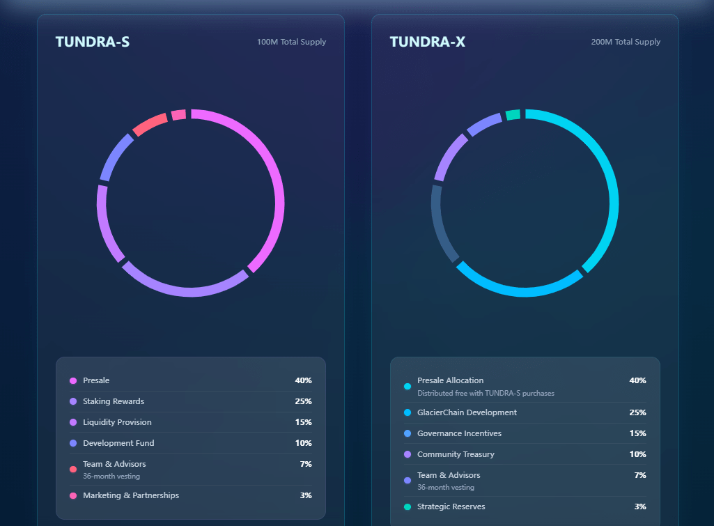 - TUNDRA-S (Solana): utility and staking token. It generates rewards and supports liquidity operations.