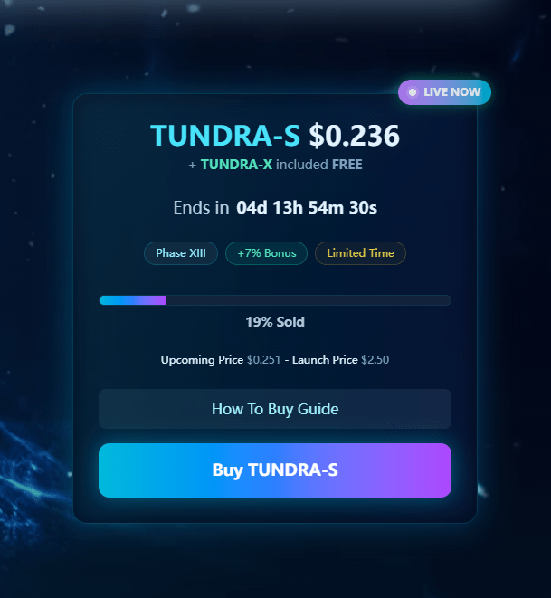 TUNDRA-S, the native token built on the Solana blockchain, was officially launched in presale in August 2025. Currently, TUNDRA-S is in its Phase XIII presale stage, priced at $0.236 per token. When it moves to the next presale stage, its price could jump to $0.251.
