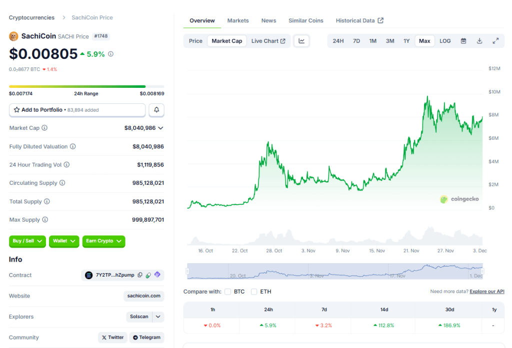 In terms of valuation, SACHI currently has a market capitalization of around $8.6 million (source: coingecko), placing it in the mid-tier range of new meme tokens at the time of writing.