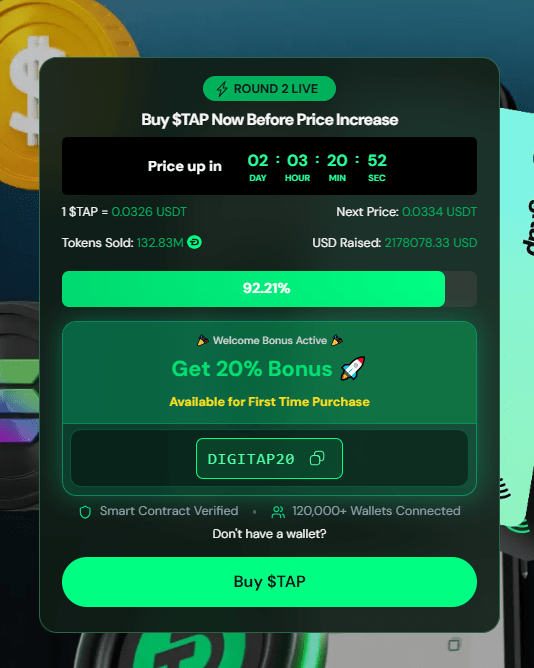 Digitap’s ongoing crypto presale has become one of the strongest performers of the year, despite the overall market weakness. The numbers confirm this: over 132 million $TAP tokens sold, with more than $2.1 million raised so far.
