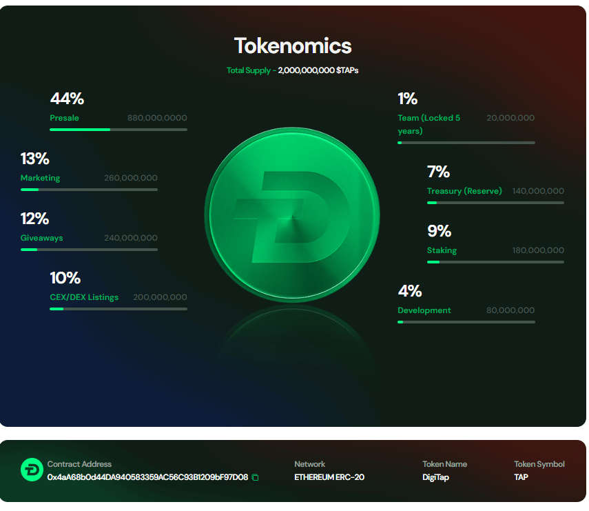 Digitap’s tokenomics are carefully designed to support long-term growth and real utility. The $TAP token has a fixed total supply of 2 billion, meaning no additional tokens will ever be minted. Its deflationary model burns tokens through platform activity, reducing supply over time and increasing scarcity.
