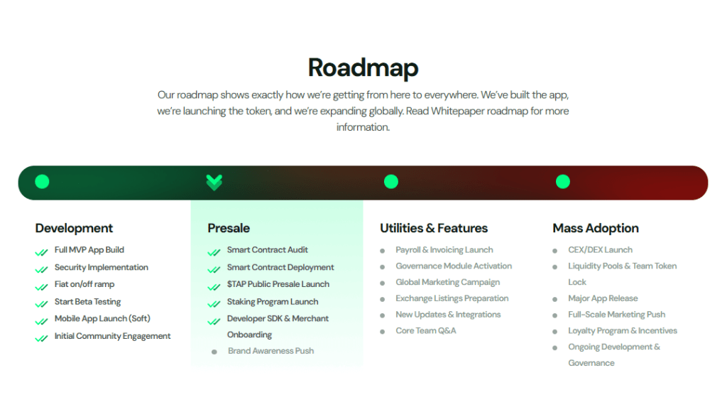 | Phase 1 – Core Platform Development | Phase 2 – $TAP Token Presale (Current) | Phase 3 – Utility Expansion & Feature Rollouts | Phase 4 – Token Launch, Full App Release & Mass Adoption |