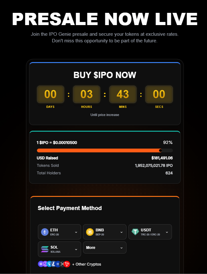 So far, IPO Genie’s presale has amassed over $181K, signaling momentum among retail traders and whales alike. Crypto Telegram channels, Twitter groups, and YouTube analysts are all buzzing about it. This isn’t paid hype, in fact, it’s a community-driven storm.