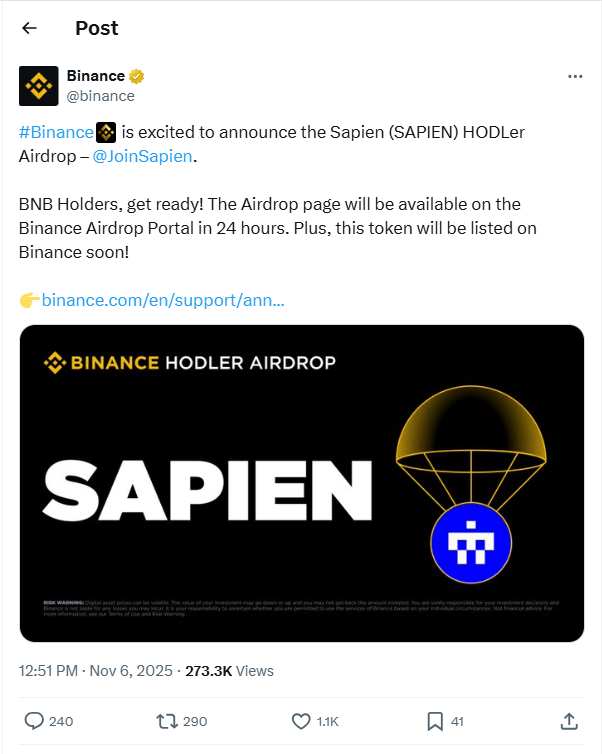 On 6 November 2025, Binance announced Sapien (SAPIEN) as the 57th project on the Binance HODLer Airdrops program. Users who subscribed their BNB to Simple Earn (Flexible and/or Locked) and/or On-Chain Yields products from 2025-10-20 00:00 (UTC) to 2025-10-22 23:59 (UTC) will get the airdrops distribution. A total of 250 million SAPIEN tokens were allocated to the program, accounting for 25% of the total token supply.