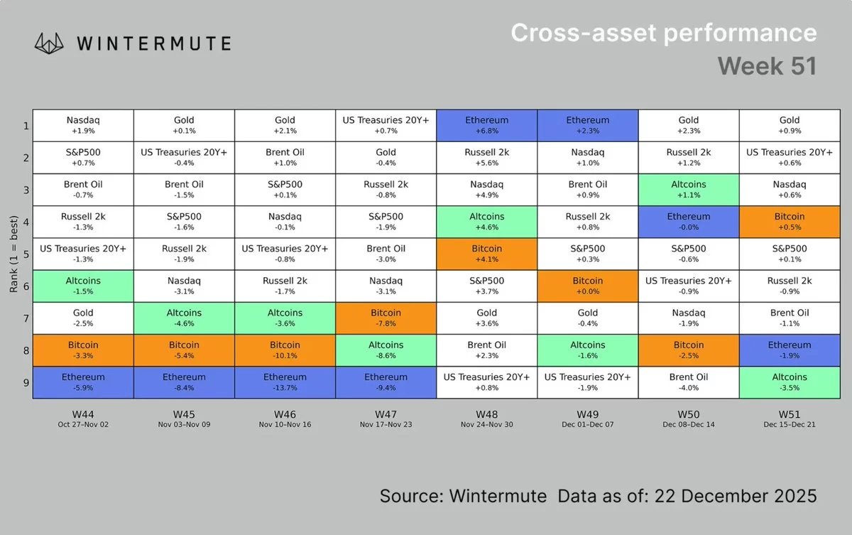 Graphical data attached to Wintermute’s report also supports the narrowing of leadership. The company’s “Cross-asset performance” chart indicates that during the 51st week (December 15–21), altcoins were the weakest performers with a -3.5% decline, while ethereum fell by 1.9%. In contrast, in the same period, Bitcoin was up by 0.5%, with gold leading at 0.9%, followed by U.S. 20-year bonds and Nasdaq at 0.6% each.