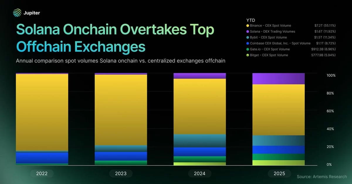 “In 2025, Solana on-chain spot volume officially surpassed all off-chain exchanges, except Binance, with a total of $1.6 trillion. According to JupiterExchange, Solana’s on-chain volumes have risen from 1% of total volume in 2022 to 12%. In 2025, Solana officially surpassed Bybit, Coinbase Global, and Bitget in terms of total volume. Meanwhile, Binance’s market share dropped from 80% in 2022 to 55%. crypto activity is swiftly moving on-chain.”
