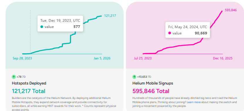 For Helium, the challenge is aligning its growing off-chain business with on-chain value. The network now supports nearly 600,000 mobile subscribers and generates steady data credit burns through carrier offload.
