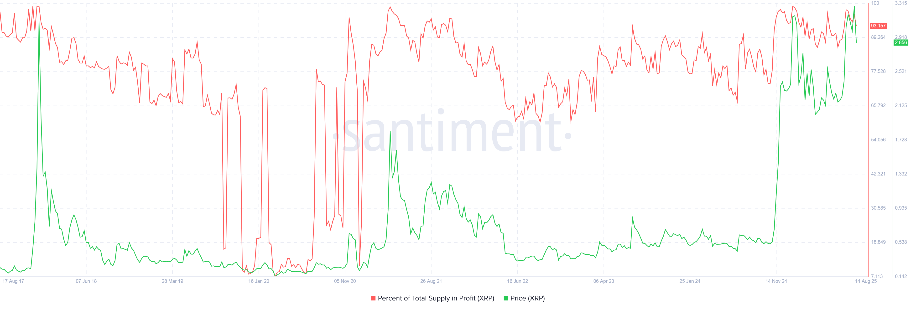 Meanwhile, more than 93% of XRP's circulating supply has been in profit since mid-July. Despite the recent market decline, holders still maintain an average profit margin above the 90% threshold. Notably, the average profit for the remittance-based token holders hasn't crossed below 80% since its strong uptrend last November following President Trump's election victory.