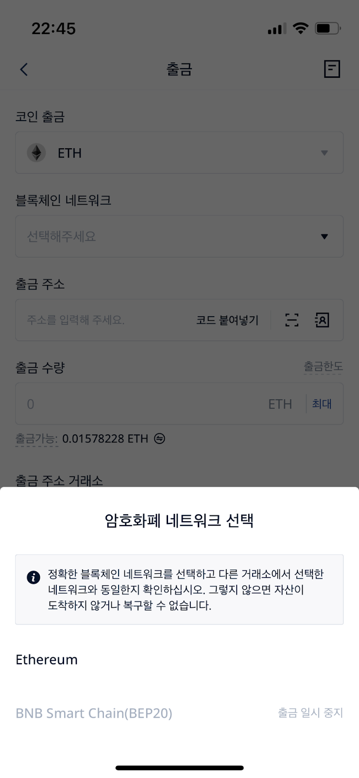출금 코인 종류 및 블록체인 네트워크: 개인지갑 주소 페이지에 표시된 것과 일치하는지 확인해주세요.