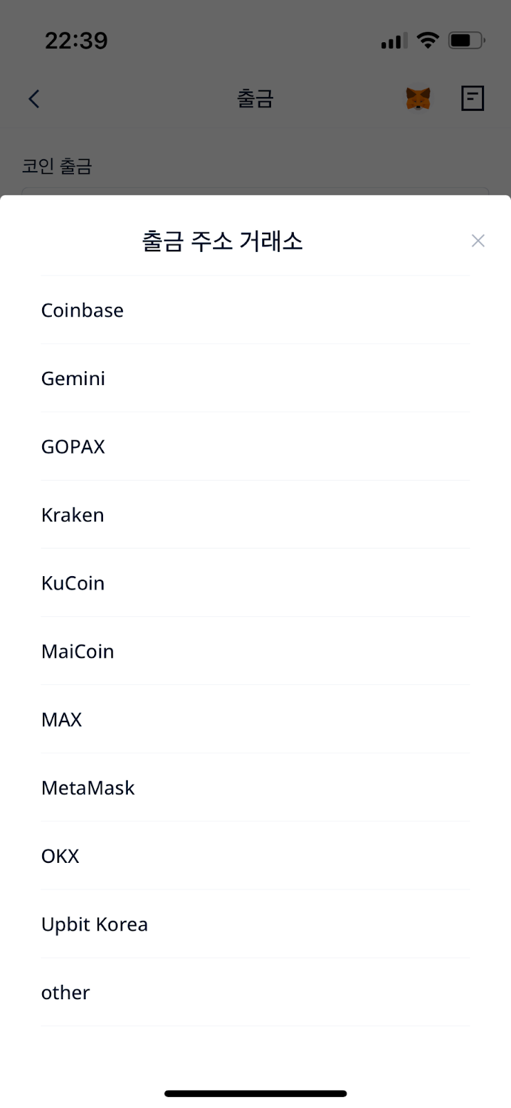 출금 주소 출처: [MetaMask]를 선택하거나 [other]를 선택한 후 개인지갑 이름을 입력해주세요.