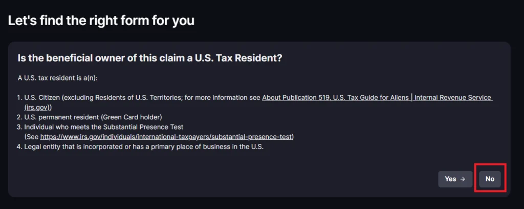 如果您是美國的稅務居民,請點擊「是(Yes)」,並填寫 W-9 表格。您不是美國稅務居民,請按一下「否(No)」。然後平台將引導您填寫 W-8。
