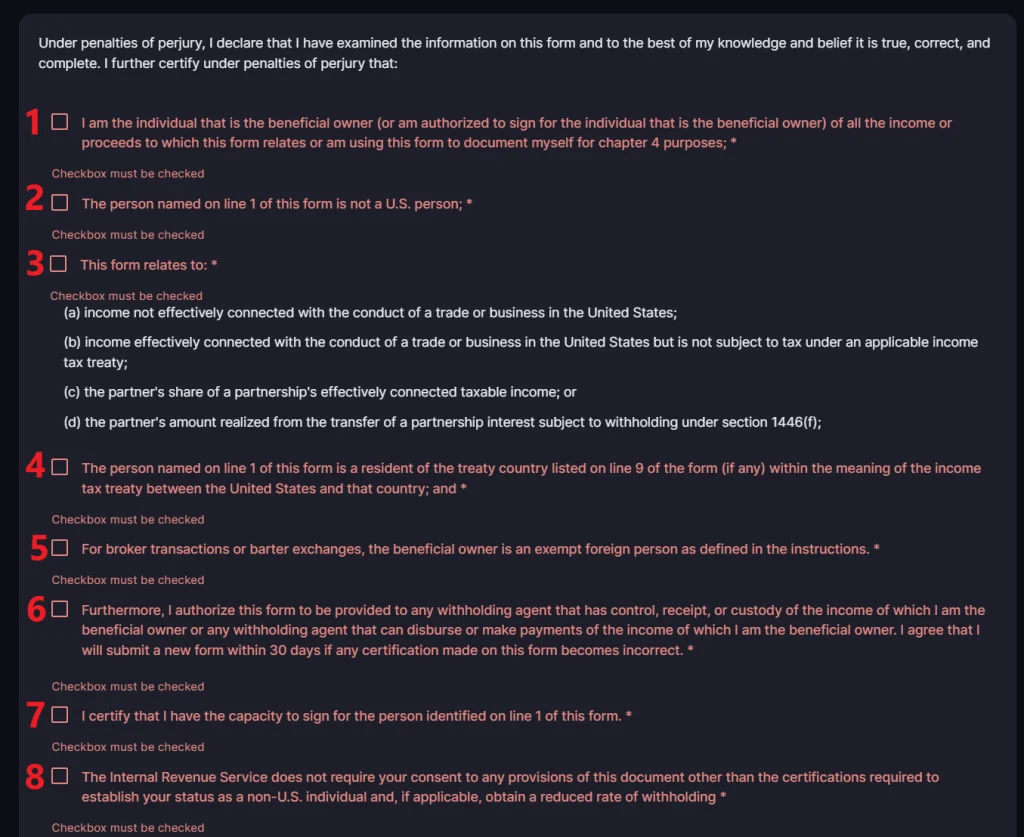 完成填寫後,您將收到一份預先填寫的 W-8BEN 表格,其中包含您剛剛提供的資訊。要驗證它,您必須選取所有標記為紅色的方塊。