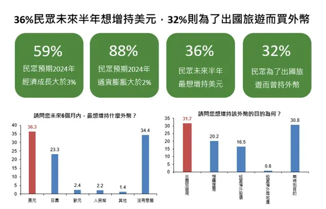 針對民眾未來半年增持貨幣的目的,調查結果也顯示,31.7% 的民眾增持外幣的目的為出國旅遊,20.2% 民眾想賺外幣的匯差,17.3% 的民眾則為了投資海外資產而兌換貨幣,30.8% 民眾則無特別目的。